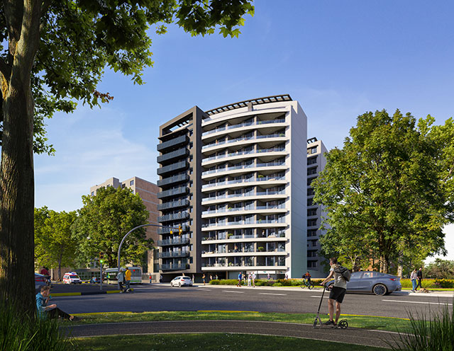 Dos edificios de 13 y 3 niveles, conectados por una pasarela enjardinada que atraviesa un gran patio central, componen este condominio cuya magnitud arquitectónica lo convertirá en un nuevo punto de referencia de la ciudad.