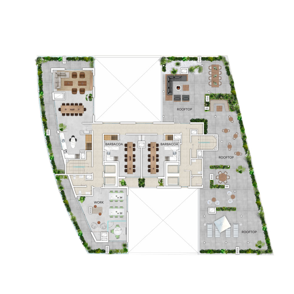 Los apartamentos fueron pensados para la vida moderna, prácticos y eficientes, pero ante todo, fáciles de mantener. Las ventanas de piso 02 a techo de alto confort acústico y las amplias terrazas, son las responsables de al conexión con la arboleda, fundamentales para TWR hacer una pausa ytomar un respiro.