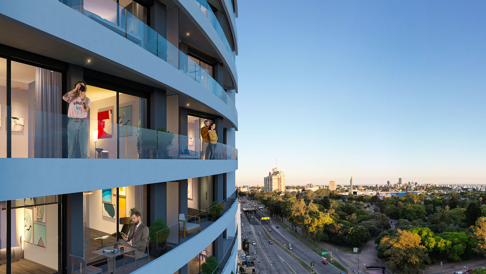 La fuerza del proyecto radica en la volumetría curva de la fachada sobre Avenida Italia, que aprovecha al máximo las vistas abiertas hacia el este que le regala el parque.